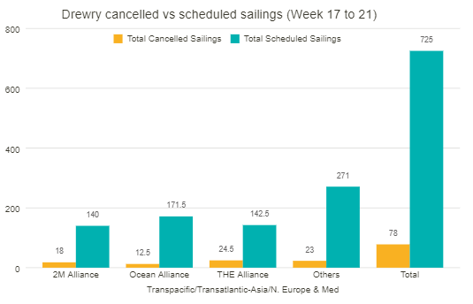 根据咨询机构Drewry于4月22日发布的航次取消周报,在跨太平洋、跨大西洋、亚欧和地中海等主要航线中,从4月25日开始的第17周至第21周期间,宣布取消的航次有78个——在725个预定航次中,取消率高达11%。