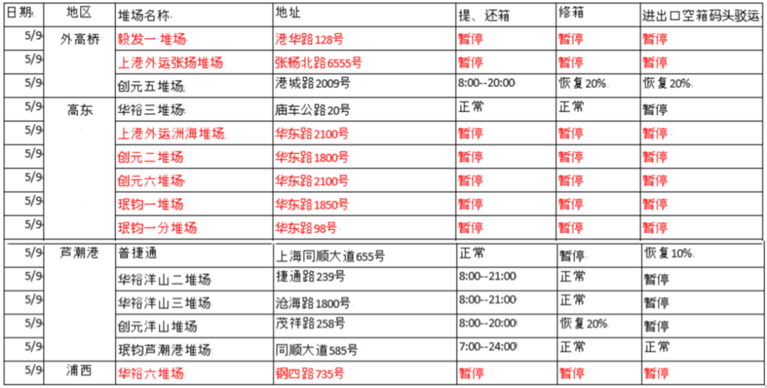 7-10号凌桥镇,10-13号高桥镇,各个堆场和暂落堆场可能面临随时关闭封控,无法提落箱,各车队调度注意实时关注船期变化和封控动态,落箱需谨慎,避免箱子上不了船的情况,导致产生一大笔额外费用。