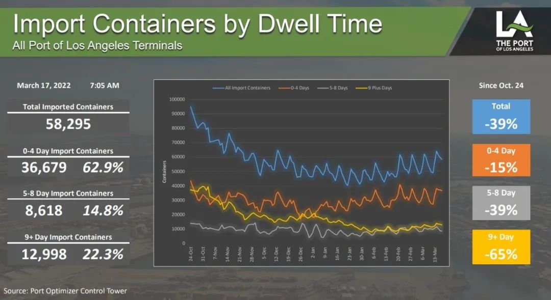 洛杉矶港近期的一份报告显示,自 10 月 24 日以来,停留≥9 天的进口集装箱减少了 65%。