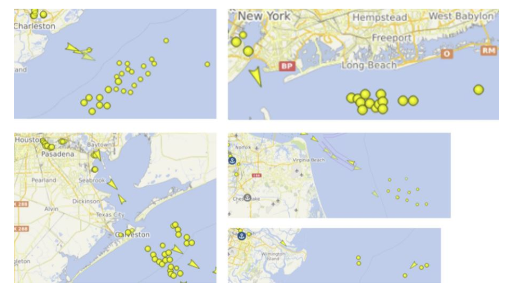 有63艘集装箱船在美国东海岸和墨西哥湾沿岸港口外等待靠泊,另外有8艘在巴哈马自由港转运中心外等待——与之相对的,洛杉矶港和长滩港外等待的船舶数量为50艘。