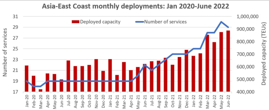根据航运数据提供商eeSea的更新数据,预计在6月份,亚洲-美东航线的部署运力将达到889,000TEU,这比2021全年平均水平增长了40%,比2020年的平均水平增长了56%。