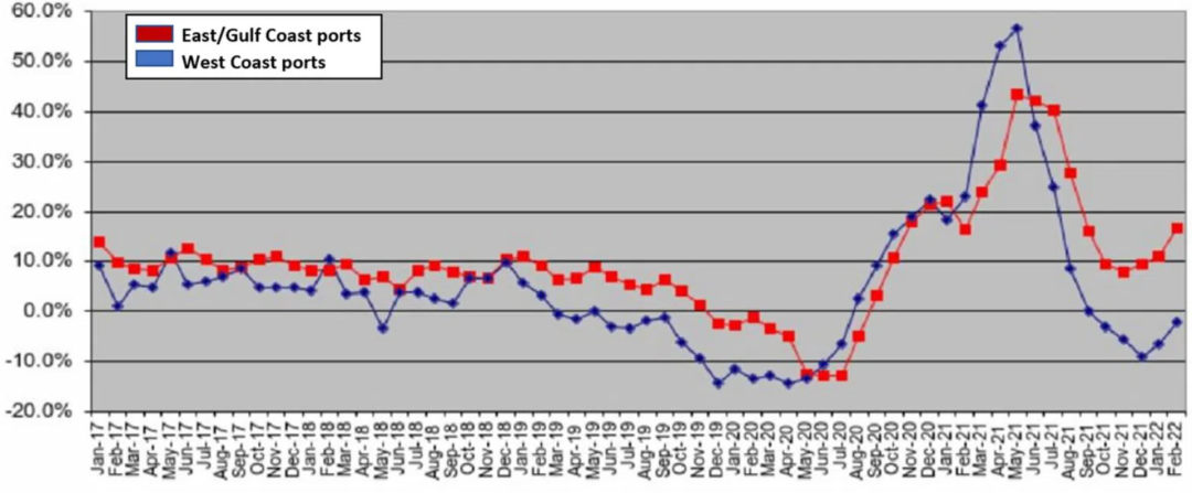 新冠疫情爆发前,美东港口的增长速度快于美西港口;美西港口在去年上半年大幅领先,但在下半年由于拥堵限制了吞吐量而回落;美东港口在2022年加快了增长速度。