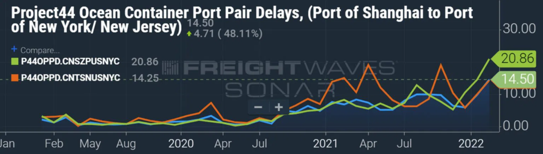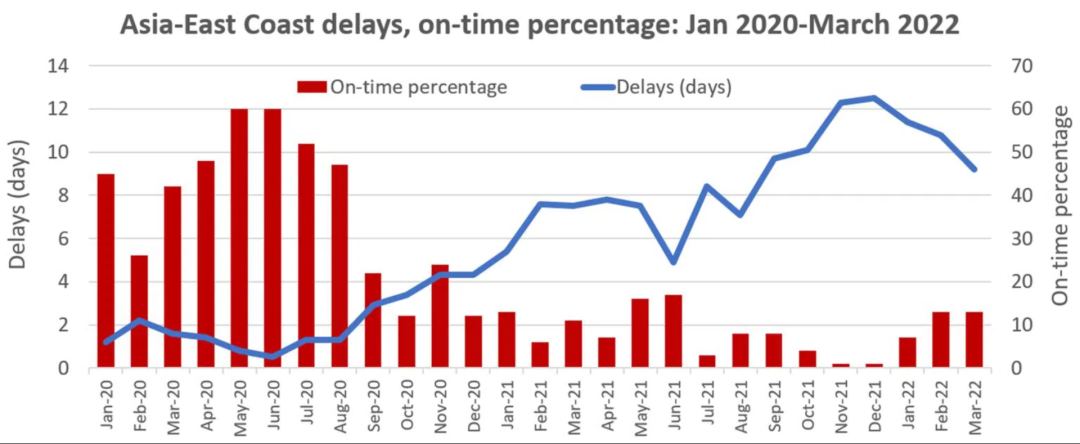 根据eeSea的数据,2020年亚洲-美东航线平均延误2.1天,而在2022年的前三个月,平均延误时间增至9.3天,4.42倍增长。