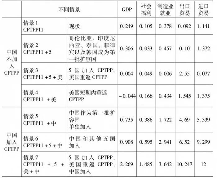 在任何情景下,中国加入CPTPP获得的收益都将比不加入有大幅增加。在不同情景下,中国加入CPTPP将会拉动GDP增长0.74-2.27个百分点、出口增长4.69-10.25个百分点,均显著优于当前中国不加入CPTPP时GDP仅增长0.25个百分点、出口仅增长0.09个百分点的情景。
