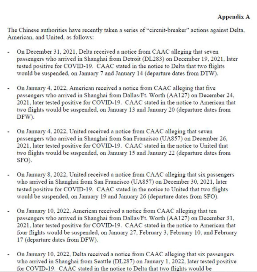 1月21日,美国交通部发出通知,将暂停四家中国航空公司从美国飞往中国的44个航班,原因是中方以一些乘客的新冠病毒检测呈阳性为“借口”,“不公平地”停航了美国联合航空公司、美国航空公司和达美航空公司的多个航班。