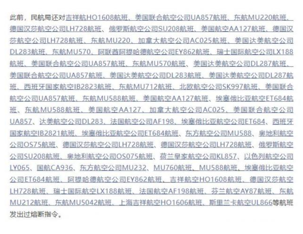 在美国交通部发表的正式指令中,附列了被中国叫停的航班清单,洋洋洒洒,非常壮观。