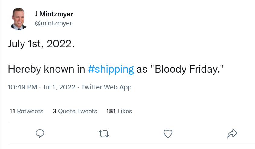 7月1日,Zim Integrated Shipping Services ( NYSE: ZIM )、Genco Shipping ( NYSE: GNK ) 和 Eagle Bulk Shipping ( NASDAQ: EGLE ) 等航运巨头的股价周五大幅下跌。因此,这个周五被称为“血色星期五”。