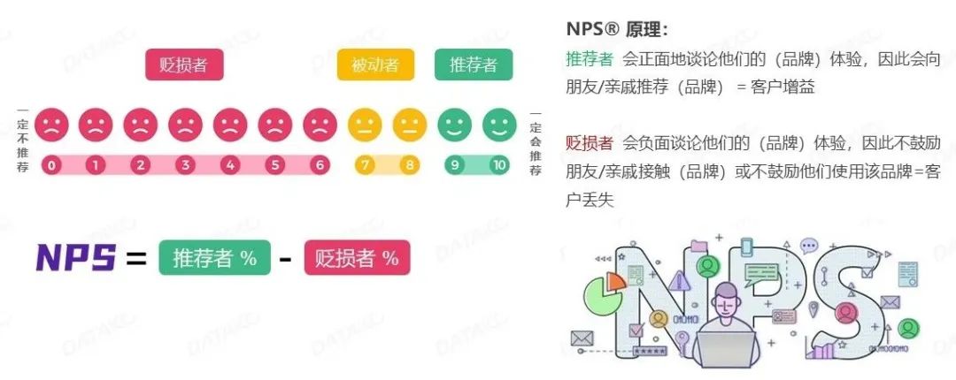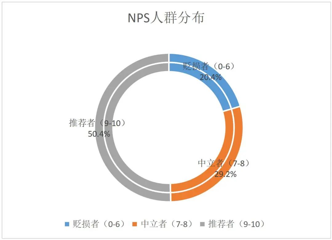 NPS=推荐者%-贬损者%,持中立评价的结果不进入计算。这个指标越高,就意味着企业在市场上的好评越多。