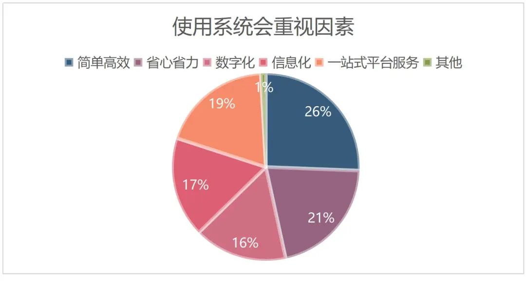 门徒娱乐发现,客户重视的是“简单高效”,“省心省力”,紧随其后是“一站式平台服务”、“数字化”“信息化”。