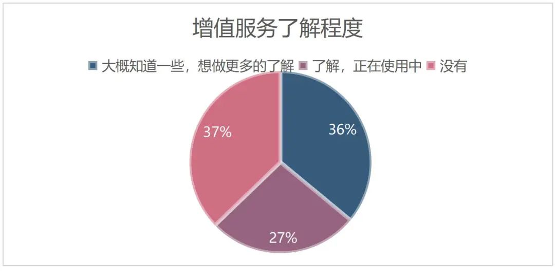 本次调研发现,大家对增值服务抱有很大好奇,而了解程度不多,仅有27%的用户表示比较了解且正在使用: