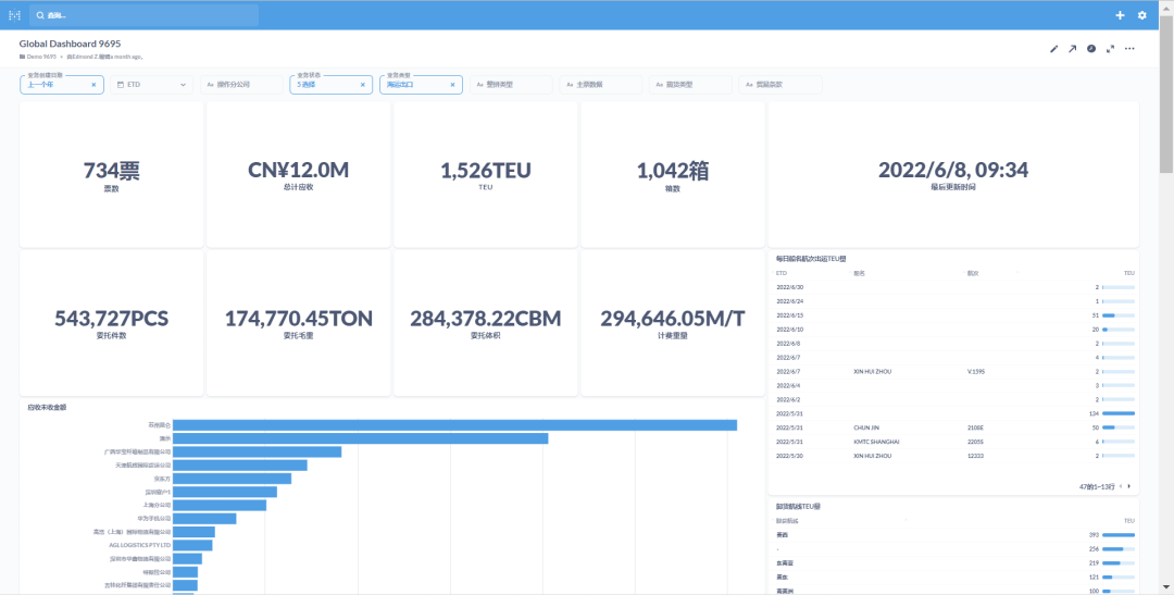 企业可随时观察核心业务指标:总计票数、箱量、单方毛利、满载率等。也有核心财务数据:应收应付统计、不同航线的利润/成本情况等。微观管理层面,可见销售KPI相关,销售提成表,业务周期时长,客户画像等;