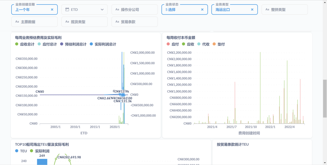 在强大的BI商务智能分析支持下,企业可以敏锐洞察现金流情况,航线情况,客户情况,及时发现资金、客户关系、航线等方方面面的风险,分析预判未来的市场变化;