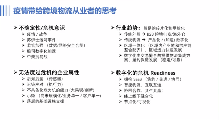 他提到疫情带来的几个重大转折趋势:一是不确定性加剧,战争等“黑天鹅”事件的预防引起各方重视;二是贸易的碎片化和零散化,由此引发对物流数字化多样性服务的需求。