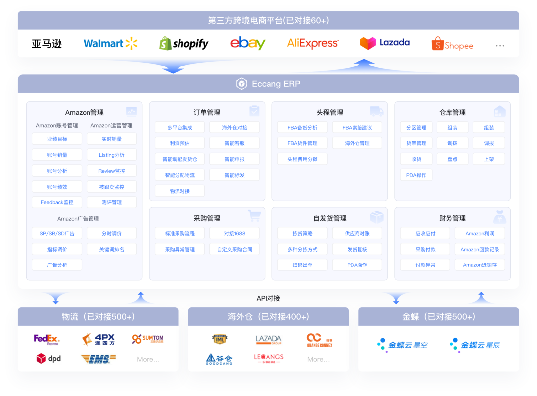 支持平台:Amazon、walmart、美客多、ebay、wish等60+跨境电商平台,全面赋能跨境卖家的全球发展。