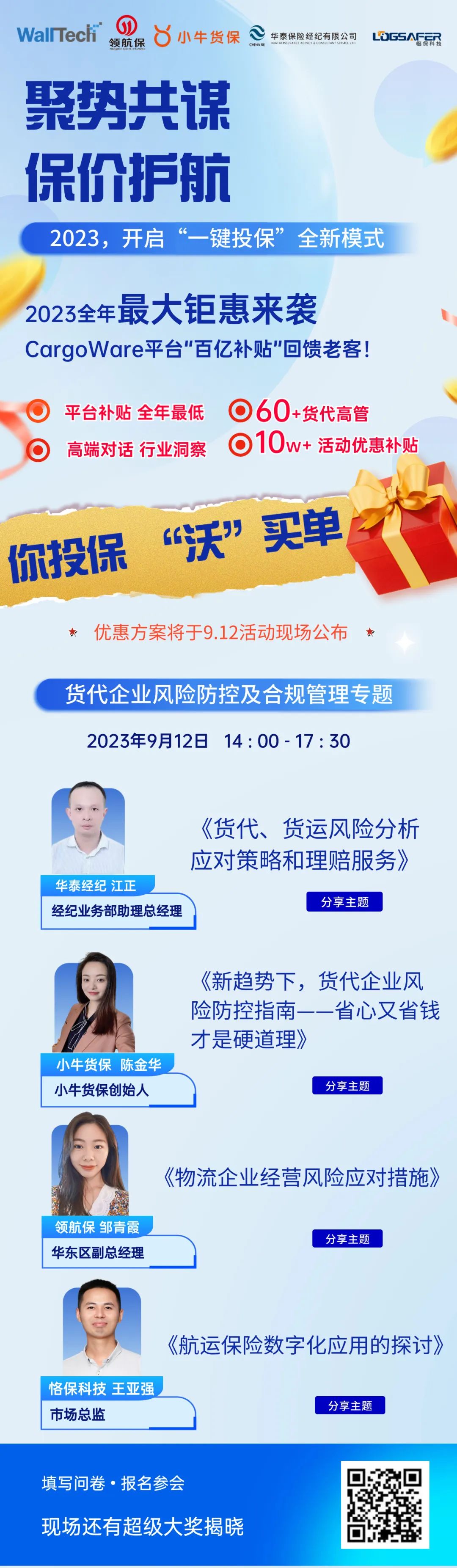 9月12日,门徒娱乐携手华泰经纪、小牛货保、领航保、恪保科技,带来《货代企业风险防控及合规管理》专题分享。这场分享大会,不仅是60+ 货代企业高管,4+ 保险行业专家组成的高端论坛,还将会揭晓今年的年度最大优惠方案,并送出: