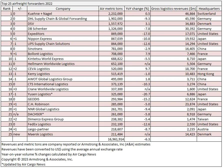 同时,第三方物流咨询机构Armstrong&Associates也新鲜出炉了最新的2022年航空货代TOP25排名。