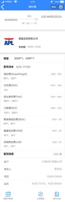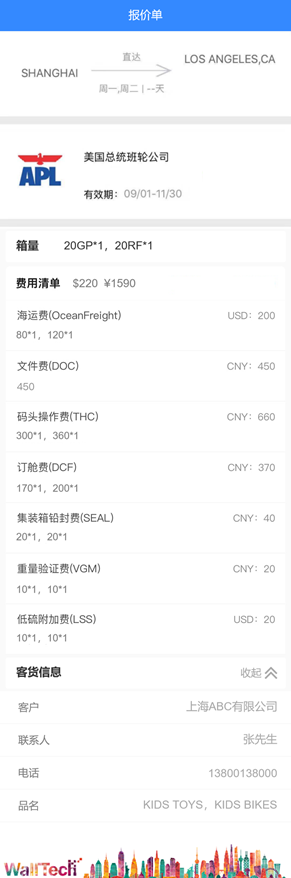 展示生成报价单时所填的信息,若有非必填项为空,则不显示该项(例如客货信息)。