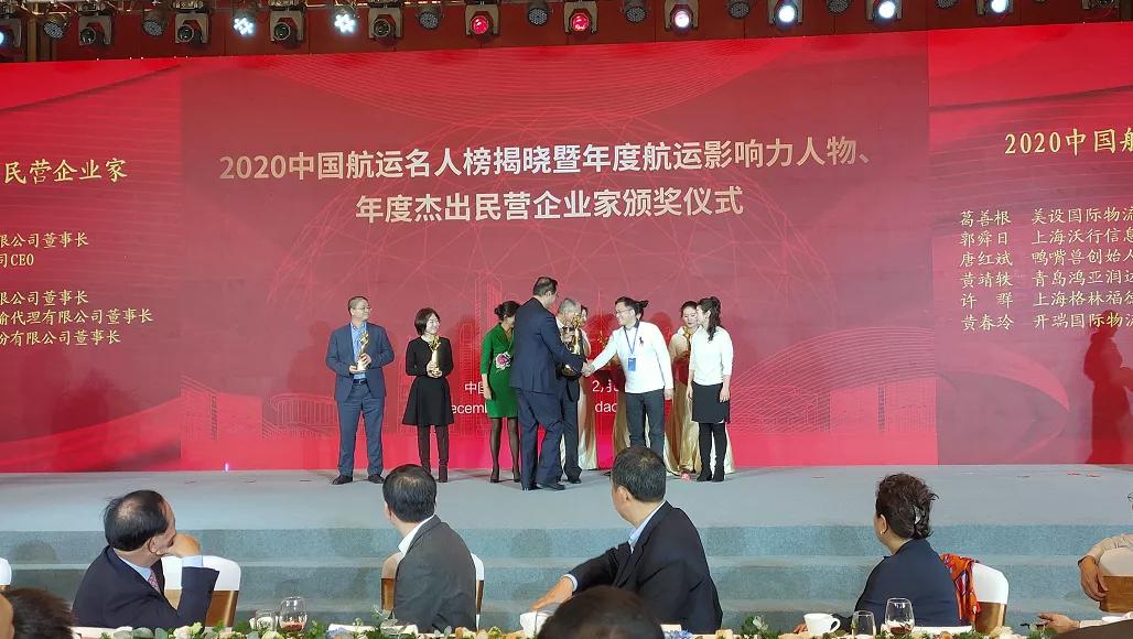 美设国际物流集团股份有限公司董事长葛善根,上海门徒娱乐信息技术有限公司CEO郭舜日,鸭嘴兽创始人唐红斌,青岛鸿亚润达国际物流有限公司董事长黄靖轶,上海格林福德国际货物运输代理有限公司董事长许群,开瑞国际物流(山东)股份有限公司董事长黄春玲,共同获得“中国航运杰出民营企业家”奖项。