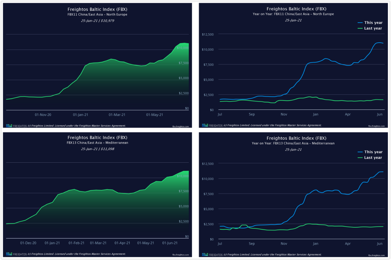 ● 上海至热那亚的现货价格上涨了603美元,达到了11448美元/40英尺货柜,比2020年同期上涨了540%。