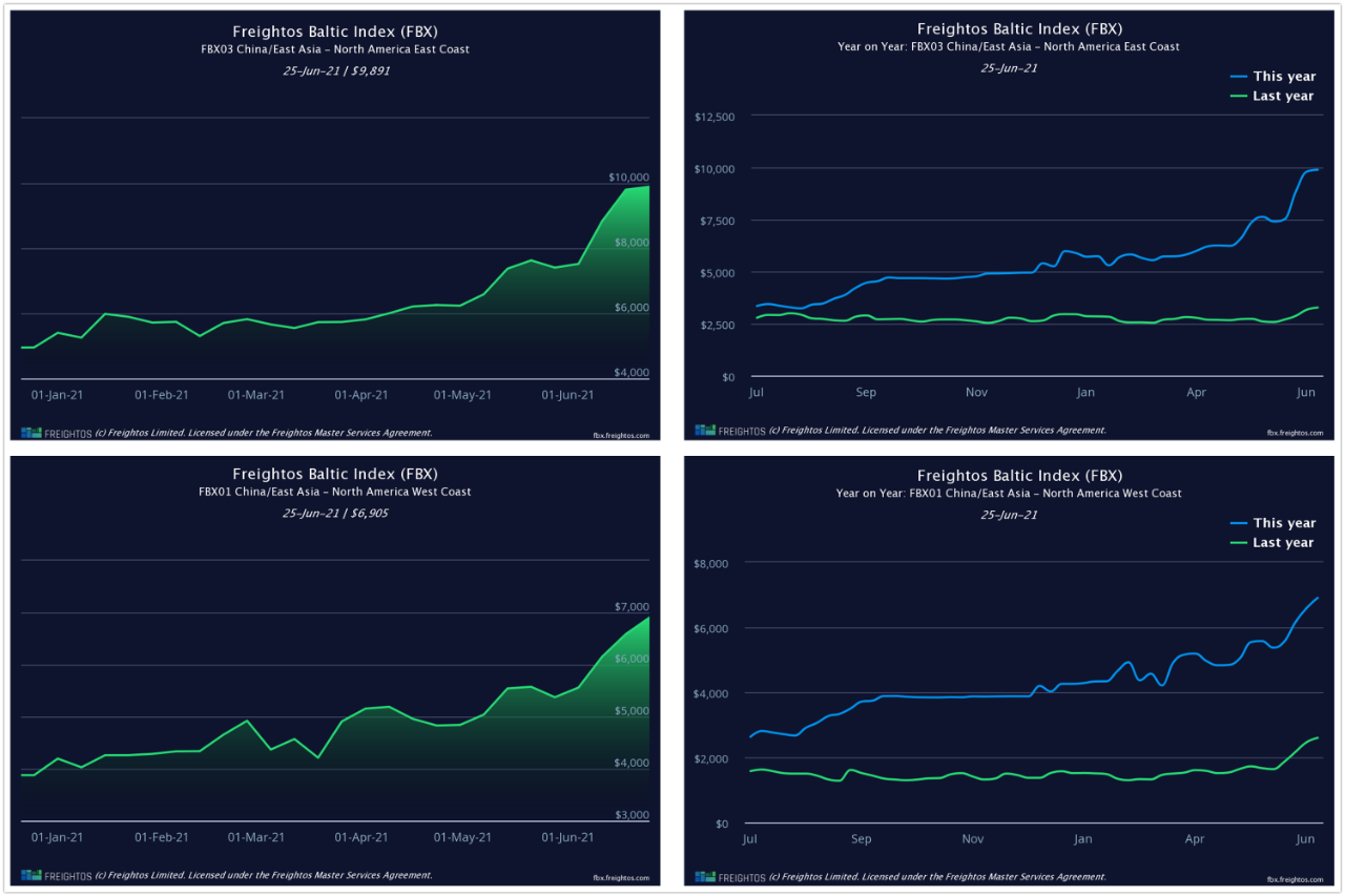 随着欧洲、美国经济活动的逐步恢复及市场对各类物资需求的增长,欧美进口需求持续保持高位。然而,由疫情导致的集装箱滞港、船舶的跳港、运输周转不畅以及港口拥堵等情况成为常态,运输市场运力紧张的僵局暂时仍未缓解,集运市场运价继续创历史记录的高企。