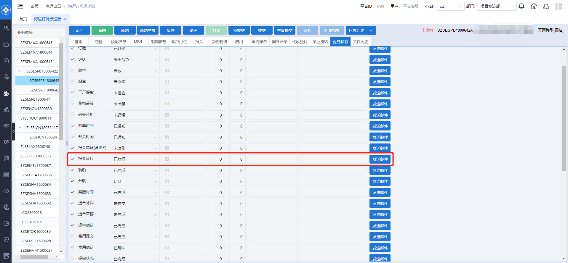 示例:设置“报关放行”时发送邮件