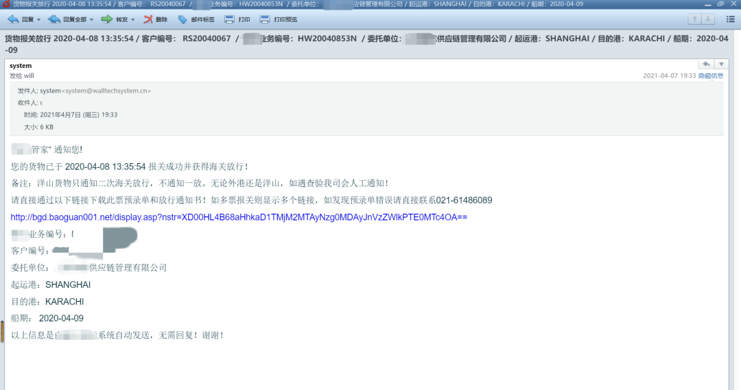 海关回执,实时推送!搭配系统自带的SOP推送功能,支持通关进展推送至邮箱或手机。