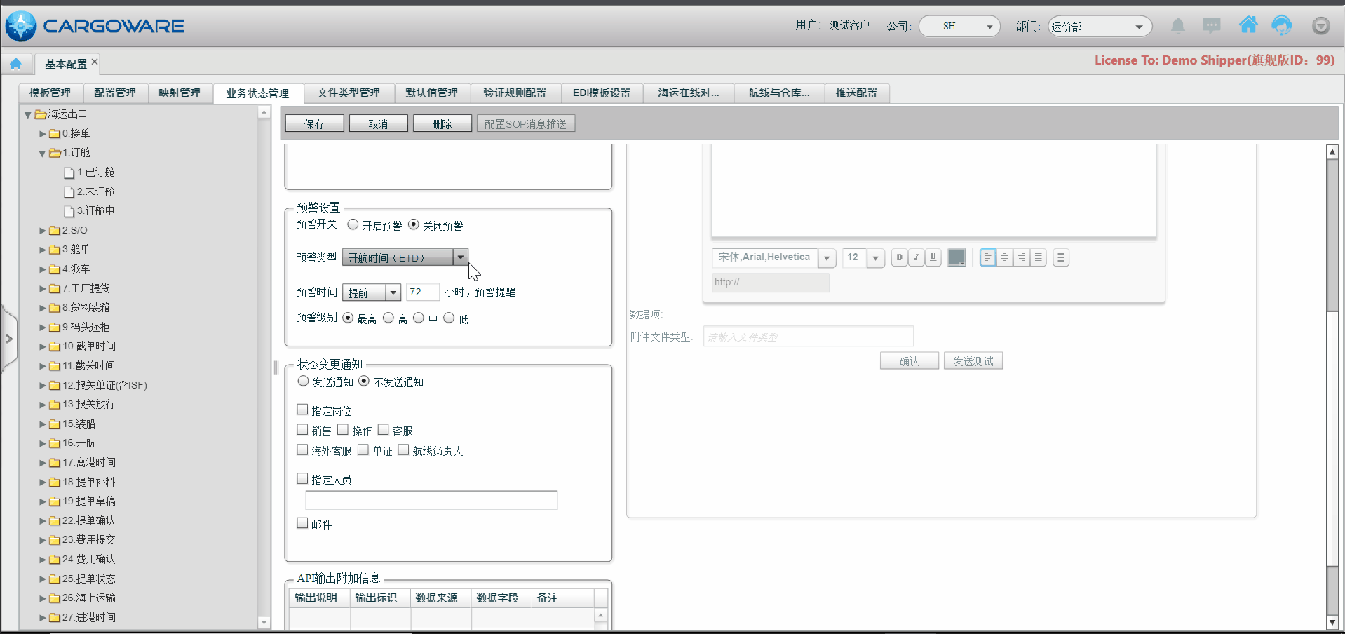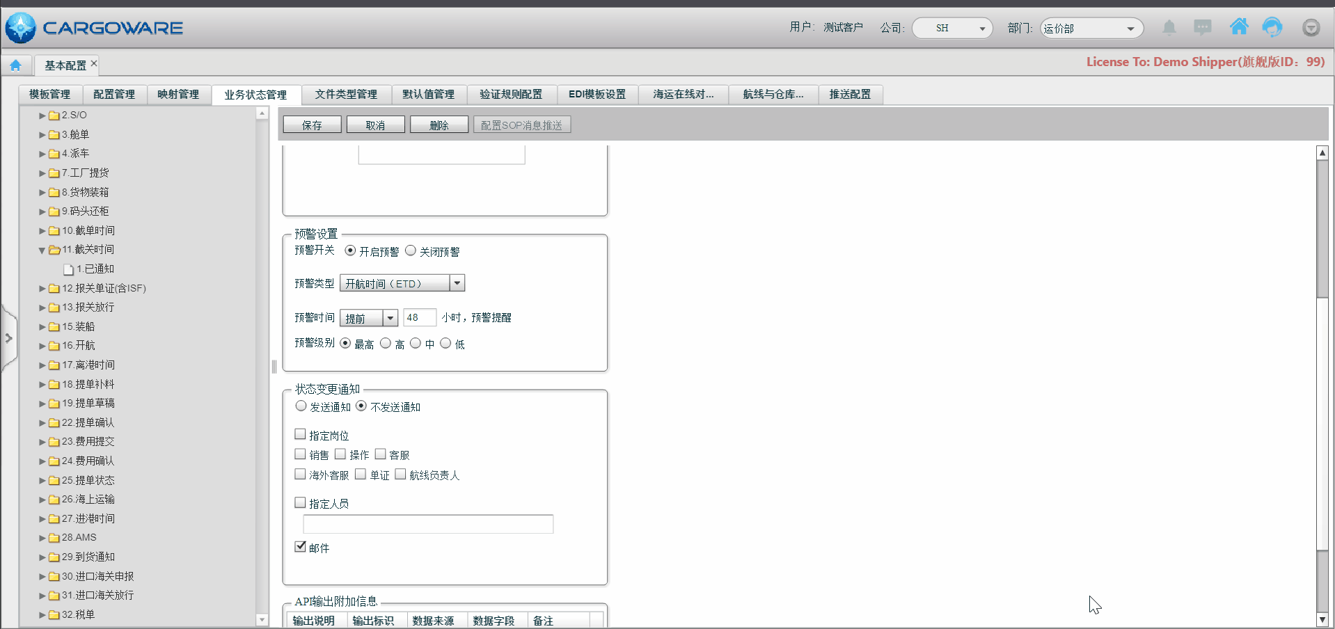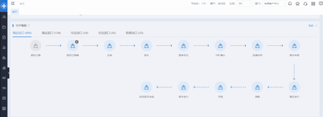 此次升级版SOP模块,将实力超凡的预警能力推向新高度。在第一版SOP基础上增设“预警消息”板块,显示业务编号、主单号、节点状态、预警内容和级别等,更直观、更细分、更灵活!
