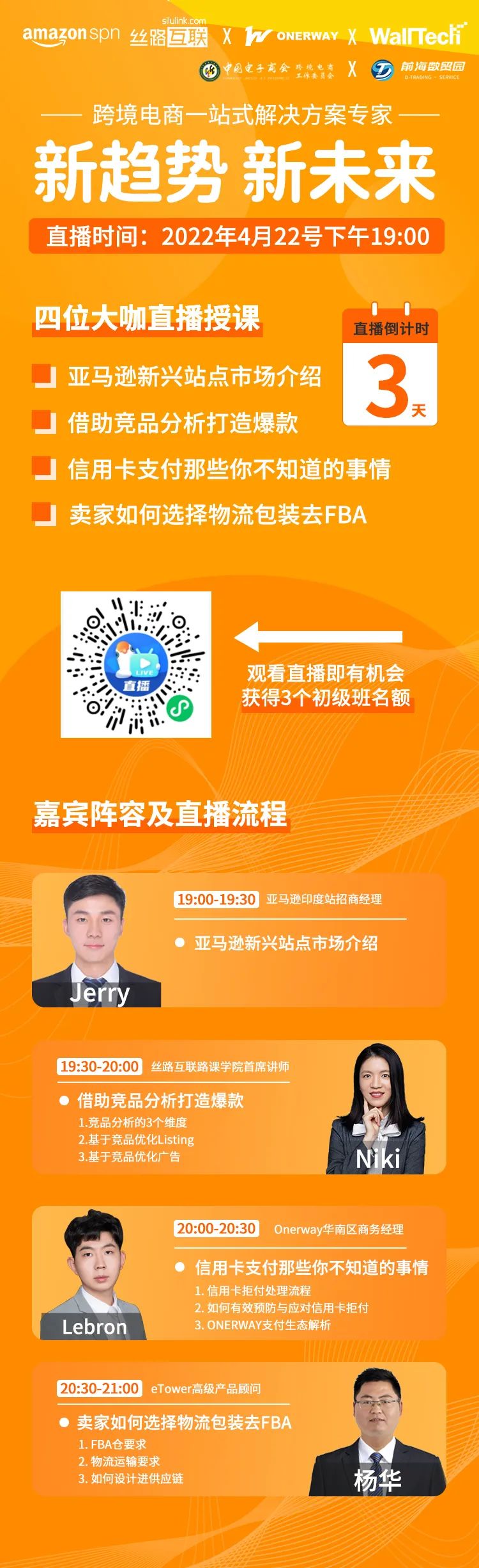 4月22日晚19:00,由丝路互联主办,携手门徒娱乐、亚马逊、ONERWAY(万唯支付),带来亚马逊知识课堂,在线答疑解惑,助力卖家突破“内卷”,发现机遇。